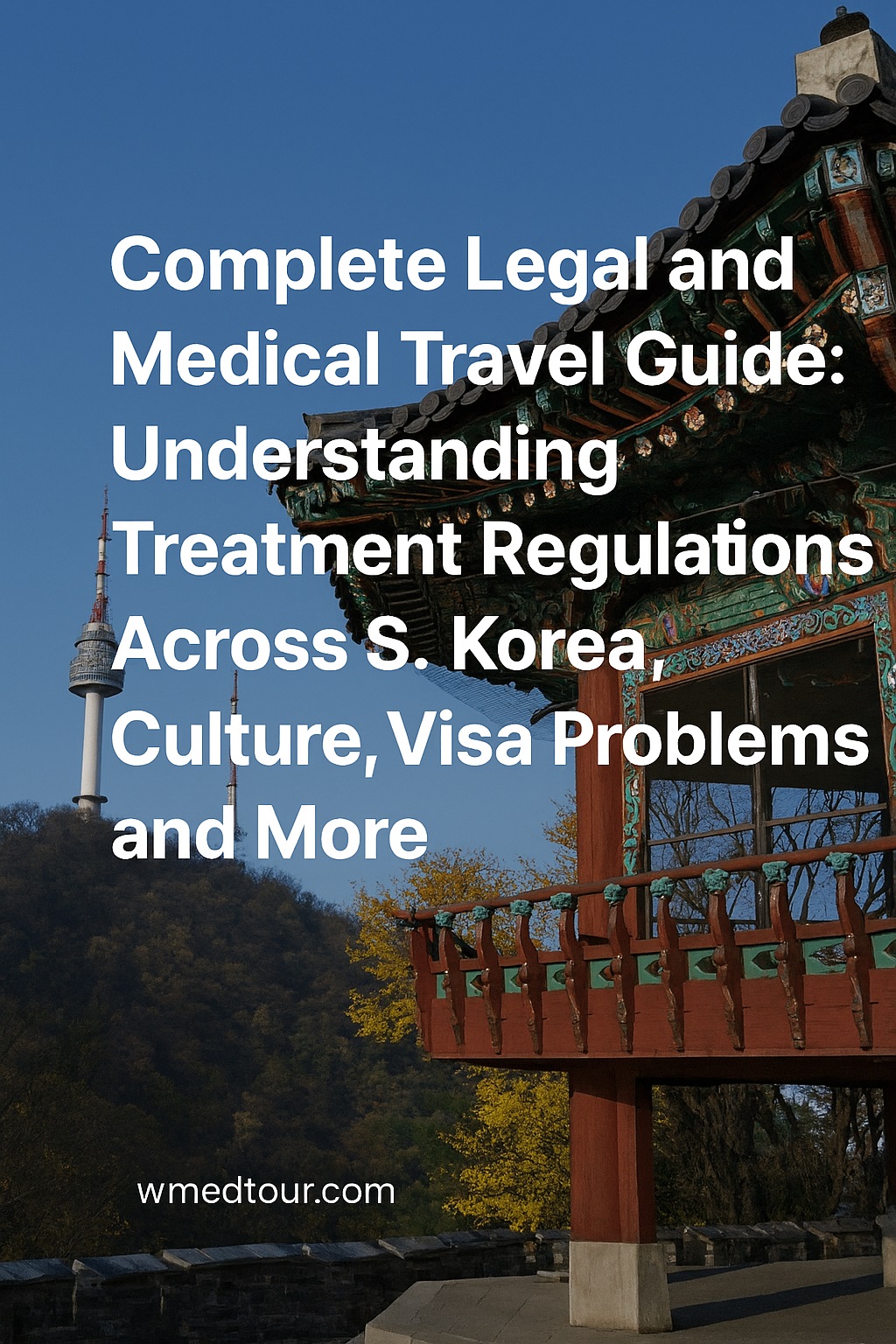 Traditional Korean temple with N Seoul Tower in the background, symbolizing South Korea’s culture, healthcare, and legal travel aspects.